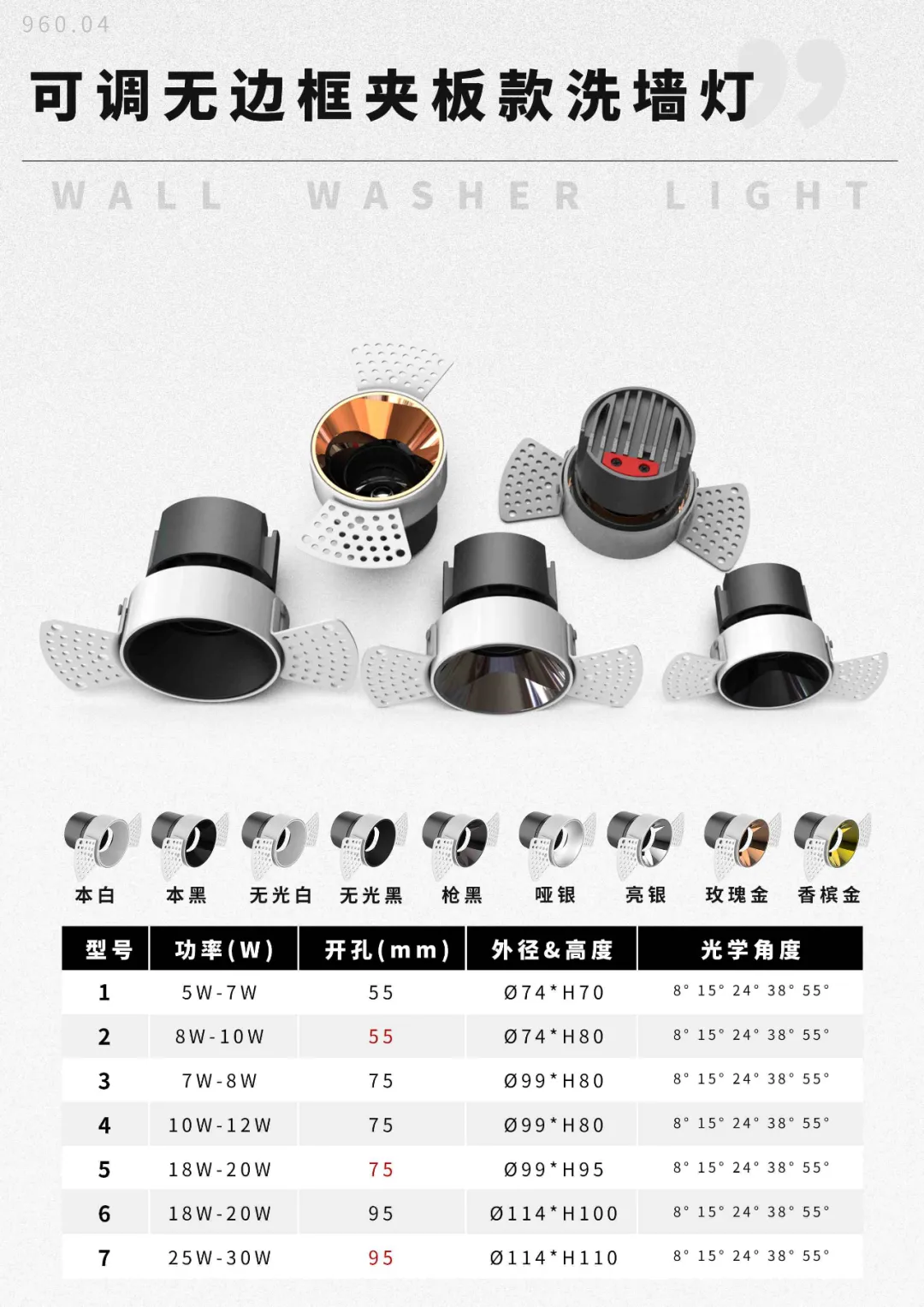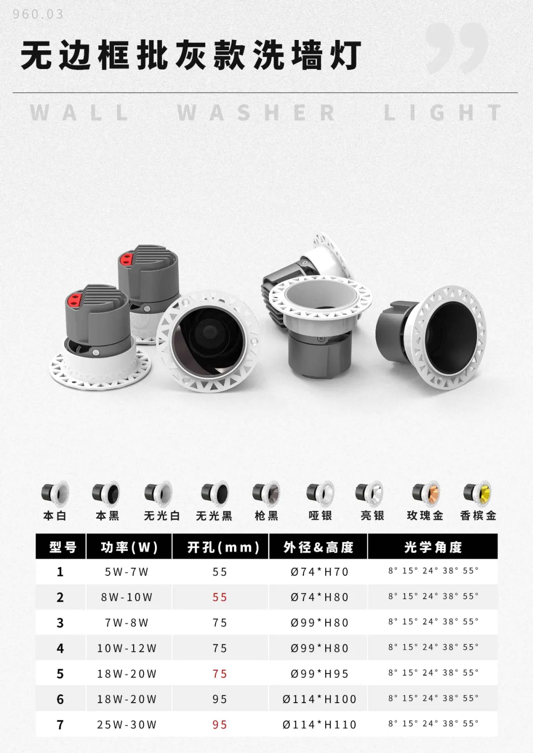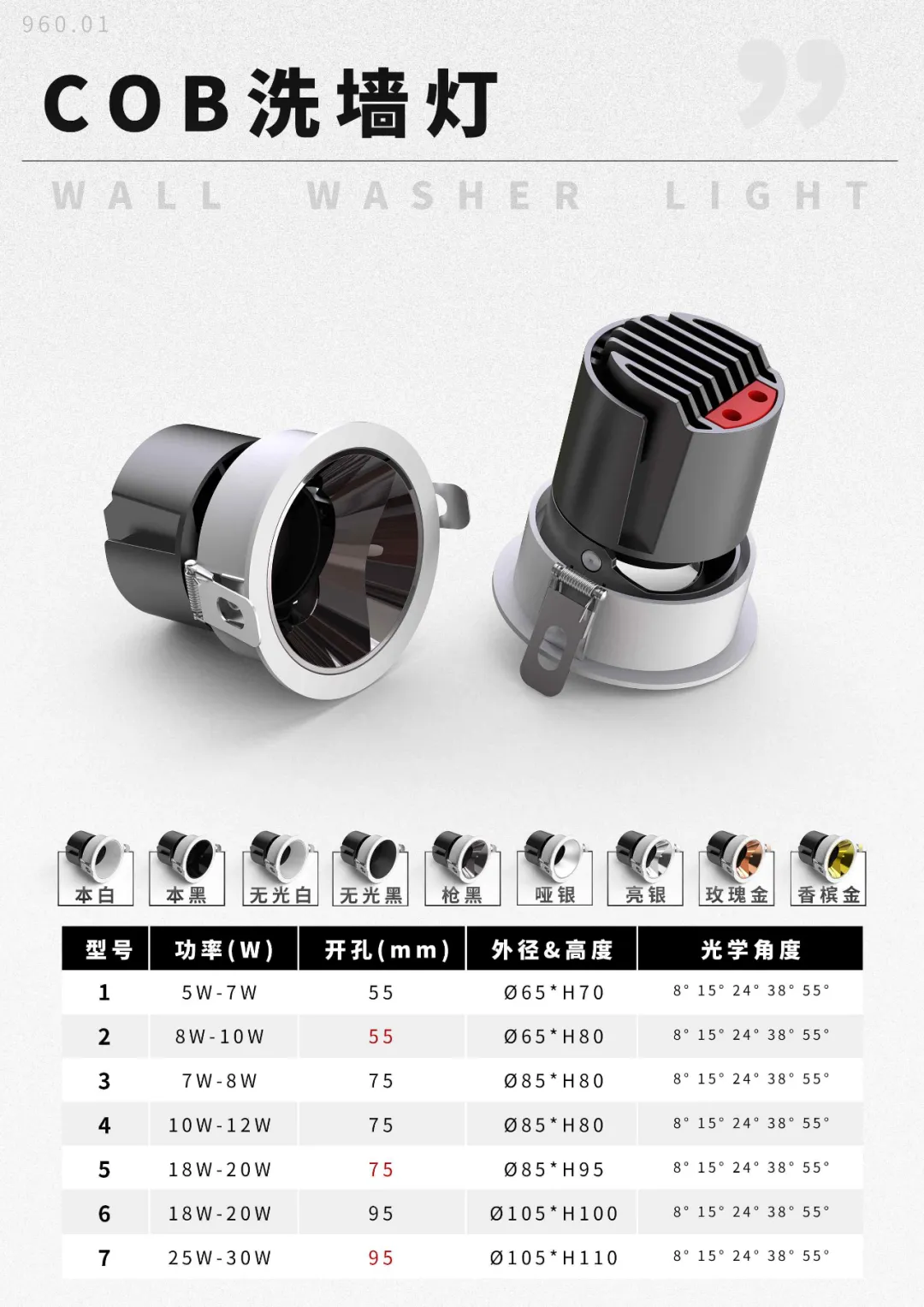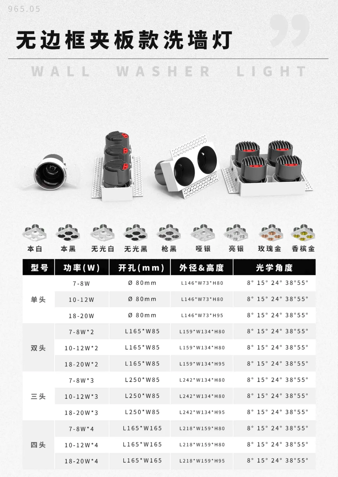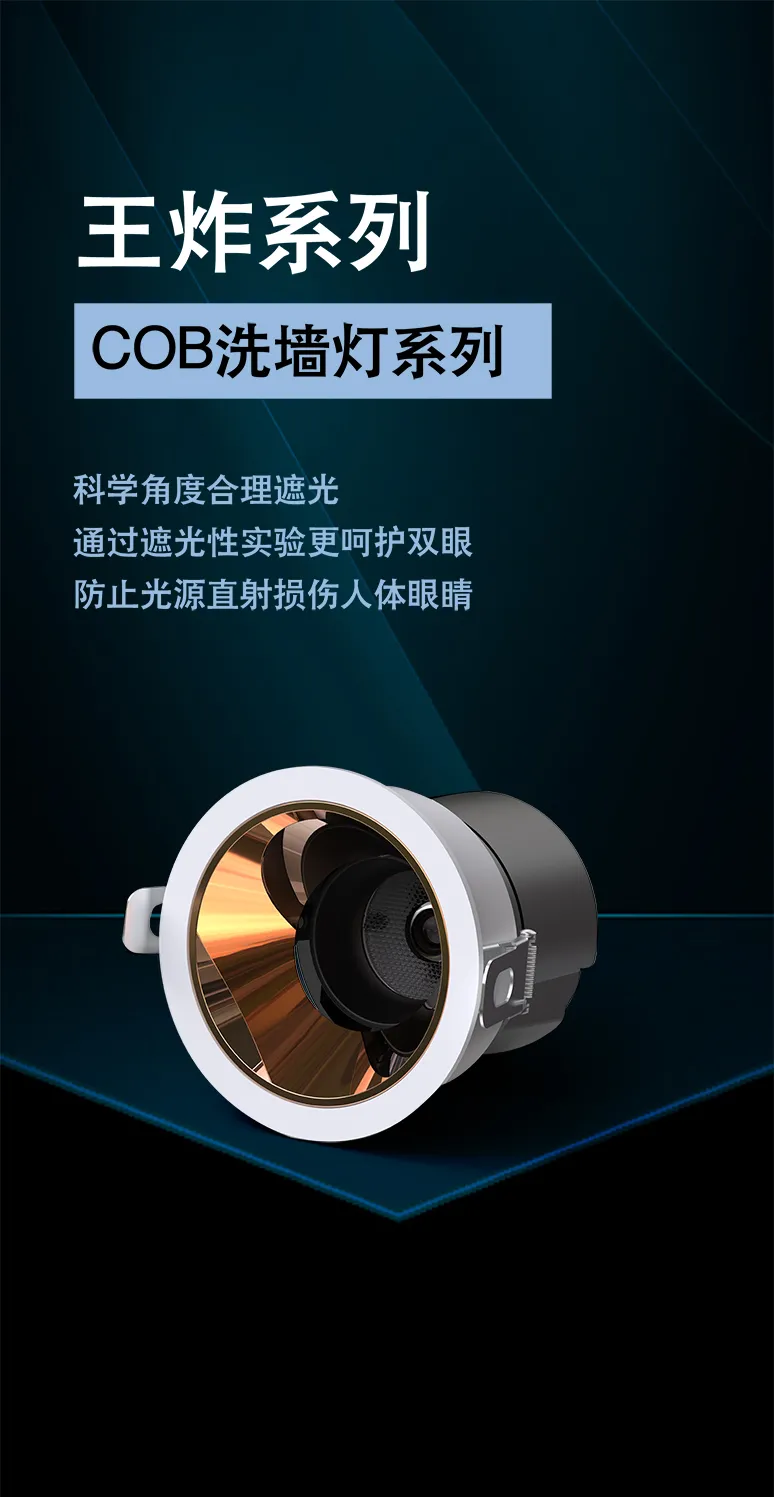 “王炸”系列LED、COB洗墙灯,提供5款外壳选择,包括:王炸无边框(夹板)洗墙灯、王炸可调无边框(夹板)洗墙灯、王炸不可调无边框(批灰)洗墙灯、王炸格栅COB洗墙灯、王炸COB洗墙灯。