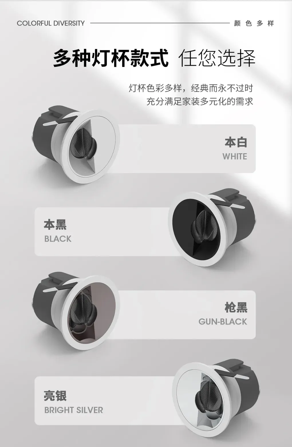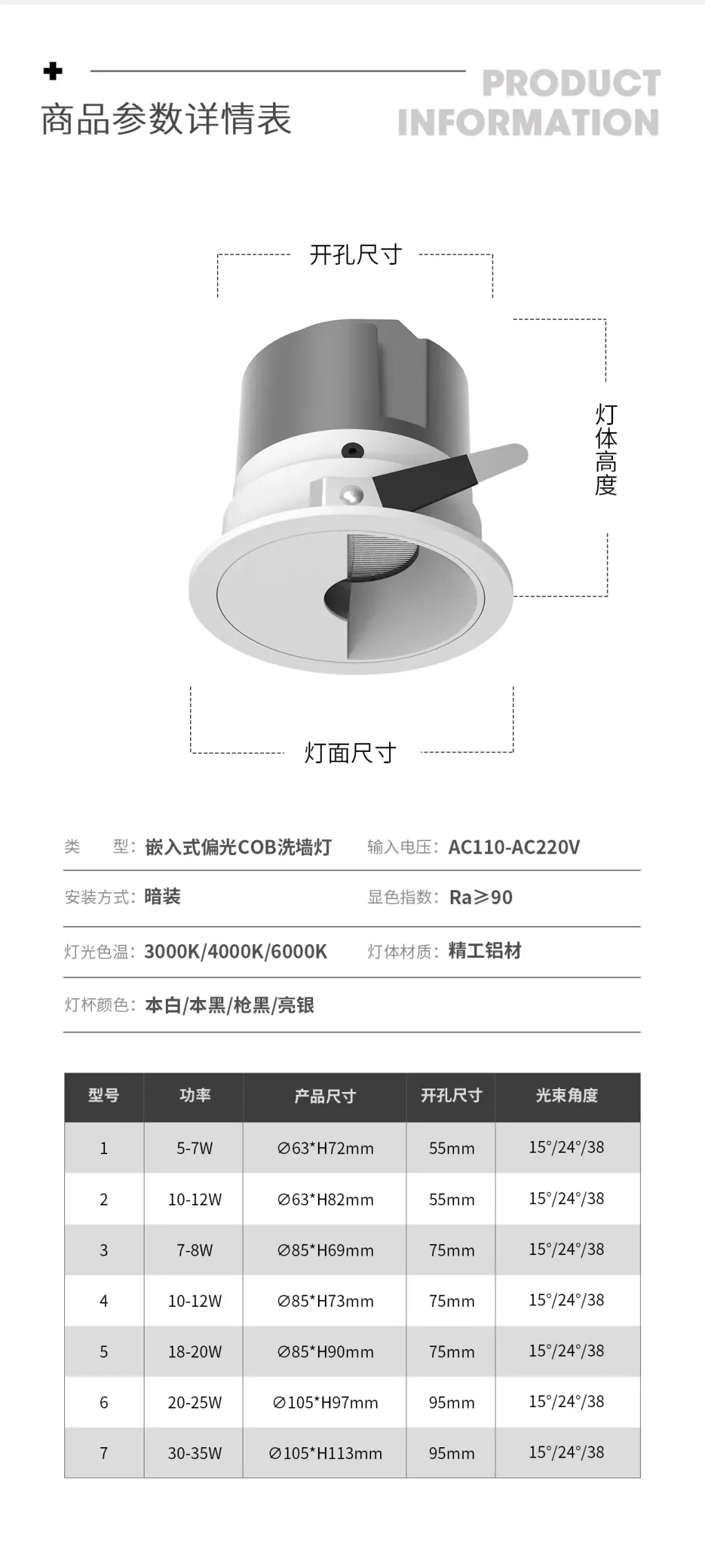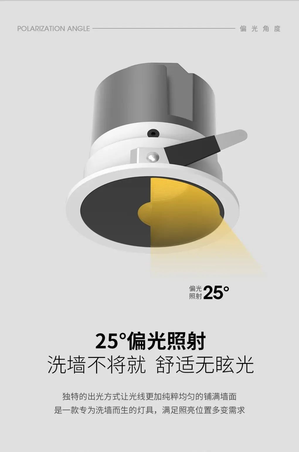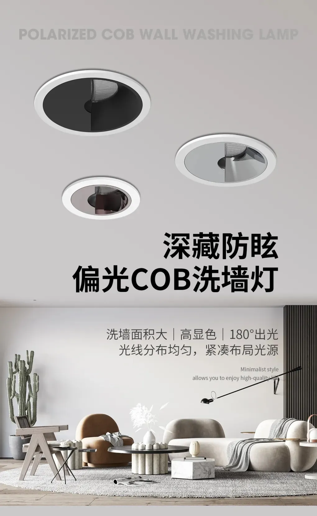 “香格里拉”系列COB洗墙灯,包含方形面盖款、圆形面盖款、窄边款,同时还有可调无边框款和不可调无边框款。“香格里拉”系列洗墙灯提供光线直照和偏光两种发光方向。