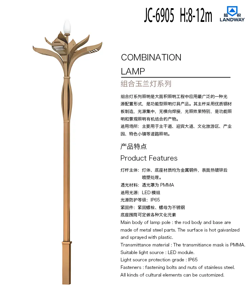 适用光源:LED模组紧固件:紧固螺栓、螺母为不锈钢底座围筒可定做各种文化元素适用场景:主要用于主干道、迎宾大道、文化旅游区、产业园、特色小镇等道路照明